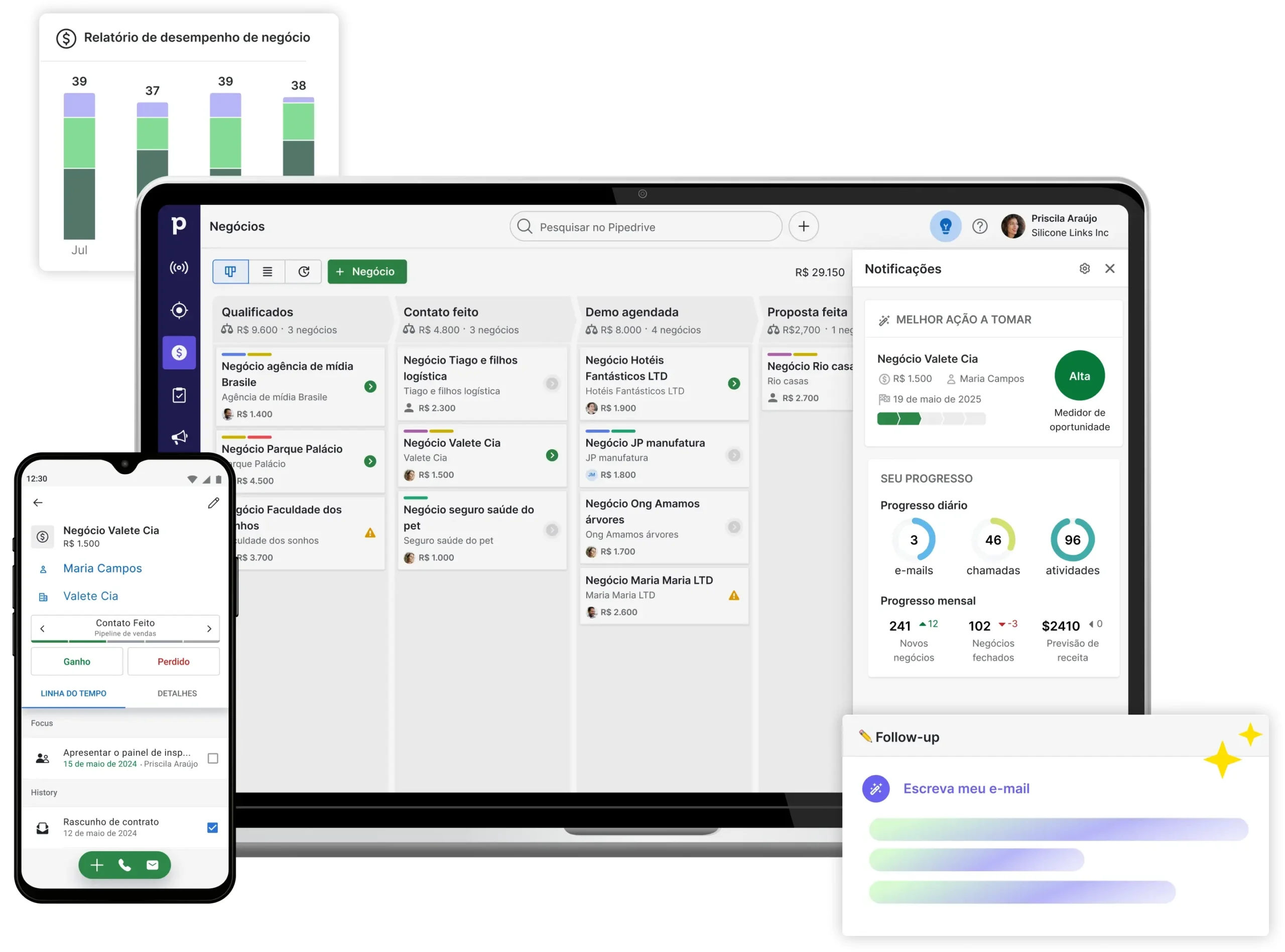 O Pipedrive ajuda sua equipe a organizar o funil, aumentar a produtividade e tomar decisões mais inteligentes com dados em tempo real, tudo em uma plataforma simples e fácil de usar.